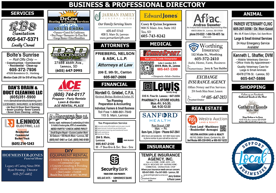 Lennox Independent's Business Directory, call 605-647-2284 to advertise here.
